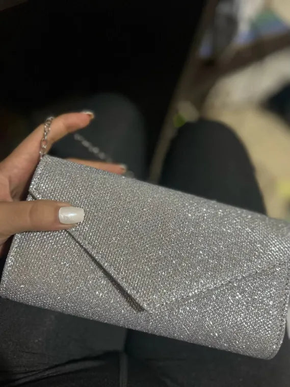 Shiny silver with glittering details. Our Glam Silver Evening Clutch is designed to enhance your elegance. Its sleek envelope design is complemented by a detachable chain strap, offering versatility. Perfect for weddings, parties, or any formal event. It holds all your essentials with style and grace. Make an unforgettable statement wherever you go.